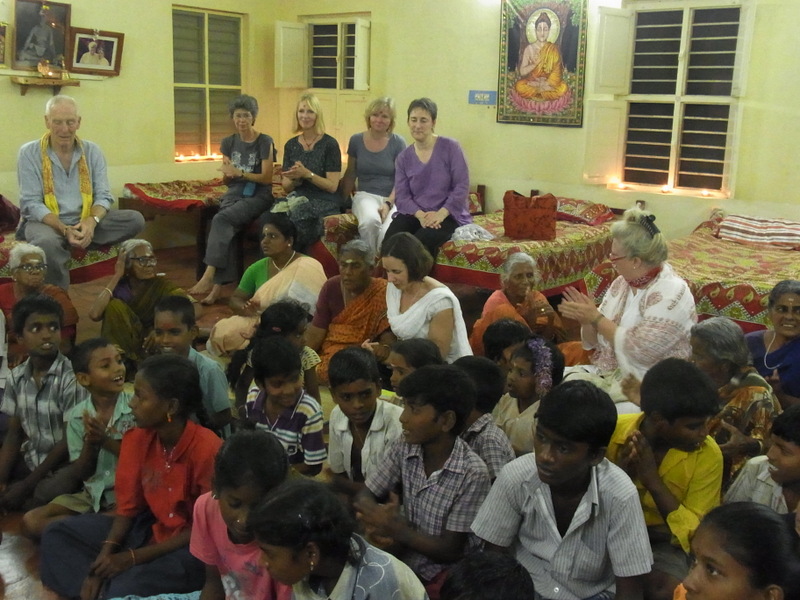 Sometimes we just enjoy ourselves! We arranged for a bus to take everyone to a fun-park, where we sat under a tree enjoying a picnic lunch. We enjoyed Bhajan – concerts in our Old Age Home with friends from the USA and Germany. We have excursions where we visit nearby temples. A number of dear Western friends on pilgrimage with Ramana shared an afternoon with the widows painting their fingernails, and received henna (temporary) tattoos, in return. A special thank-you, dear Ramana, and your pilgrimage participants for donating the wonderful solar-light, which is now illuminating the entrance of the home! There are regularly scheduled power-cuts at night, and this light provides an even safer environment for the widows.