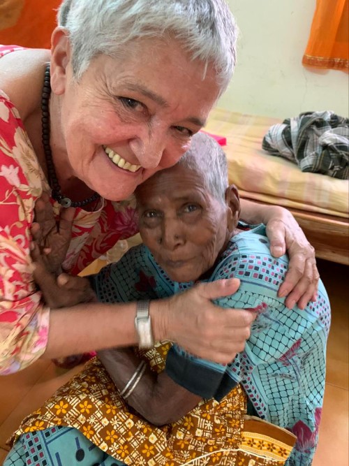 Mit liebevoller Betreuung, wie sie sie bestimmt noch nie erlebt haben. Herzlichen Dank Kathy und allen Spendern und Spenderinnen, die dazu beigetragen haben, dass dieser Traum, von einem Ort, wo heimatlose ausgestoßene Frauen einen friedlichen Übergang erleben können, Wirklichkeit geworden ist. Wie sehr wünsche ich mir, dass Ihr alle es erleben könntet, wie glücklich Bewohnerinnen und Betreuerinnen (auch Witwen) sind. Die Tatsache, dass das Glück, das wir geben, vervielfacht zu uns zurückkommt, ist hier ganz deutlich zu erkennen. Alle 30 Bewohnerinnen und ihre sieben Betreuerinnen, rund um die Uhr, sind Kraftwerke der Liebe und Freude…… Das empfinden auch die vielen Besucher so, die hier für bzw. mit den Frauen musizieren, malen, Karten und Ball spielen, massieren, Yoga machen oder sich mit Henna bemalen. Jetzt zu unseren neuen/ alten Bewohnerinnen. Unsere älteste, erste Frau war Janaki, damals schon fast 90 Jahre alt. Im November 2017 hat ihre Tochter sie zu sich geholt. Ende Januar 2018 (nach 2 Monaten) hat Manoharan sie nachts auf der Straße gefunden: völlig entkräftet, nur noch Haut und Knochen, in Lumpen gekleidet, ohne ihre Brille, mit Panik und Angst im Blick. Jede von uns hat geweint bei ihrem Anblick! Ihre Tochter hat sie zum Betteln an die Straße gesetzt!!!!!!! Unvorstellbar für uns!!! Jetzt ist sie langsam zur Ruhe gekommen. Sie schläft viel und kann ununterbrochen essen. Der irre panische Gesichtsausdruck ist verschwunden und sie kommuniziert auch zeitweise mit den anderen Frauen. Sie ist jetzt die erste Bewohnerin vom Kati-Heim zusammen mit Sarathas und mit Anniyammal. Anniyammal kam zu uns im März 2017. Ihr Schwiegersohn hat sie nackt, nur mit einem schmutzigen Betttuch an die Straße gesetzt zum Erbetteln seines Alkoholkonsums. Mehrere Versuche von uns, auch Polizeieinsatz haben nur kurzfristig genützt. Sie hat sich nur ganz langsam eingelebt. Ihr winziger Körper ist auch nur Haut und Knochen. Sie sitzt meist in der Hocke und verbirgt ihren Kopf in den Händen oder einem Schal. Sie isst und schläft gut und wird abwechselnd, wenn die gehfähigen Frauen draußen ihren Spaziergang machen, im Rollstuhl mitgenommen.